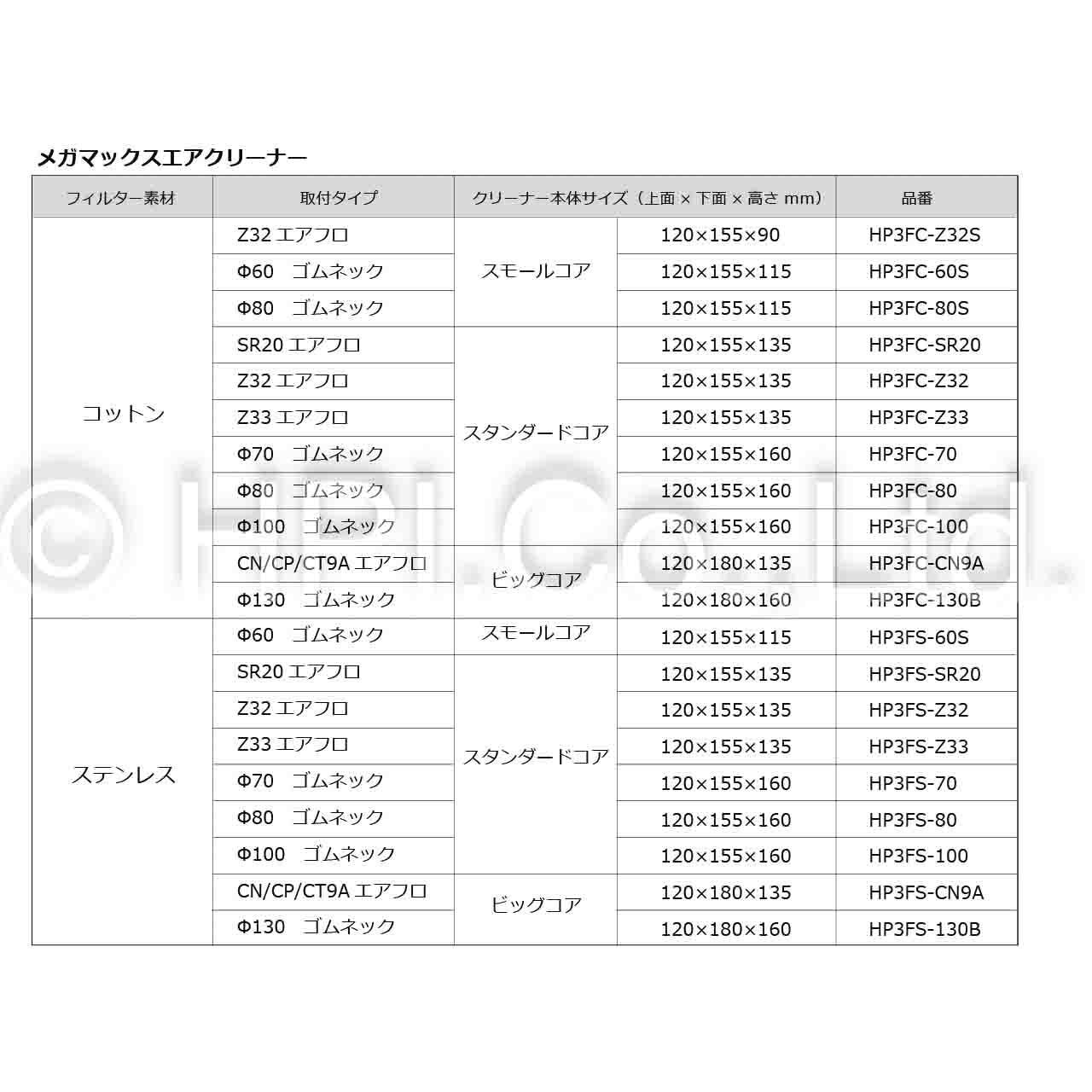 HP3FS-##S:メガマックスアエアクリーナー ステンレス スモールコア