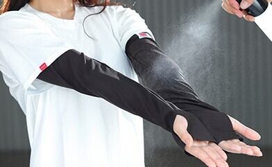 独自技術により実現した超吸収・超拡散機能により気化熱を効果的に発生し、優れた冷却効果をうむ最先端素材です。(*1:表面温度の冷却効果は他の素材に比べ最大10℃の温度差)
