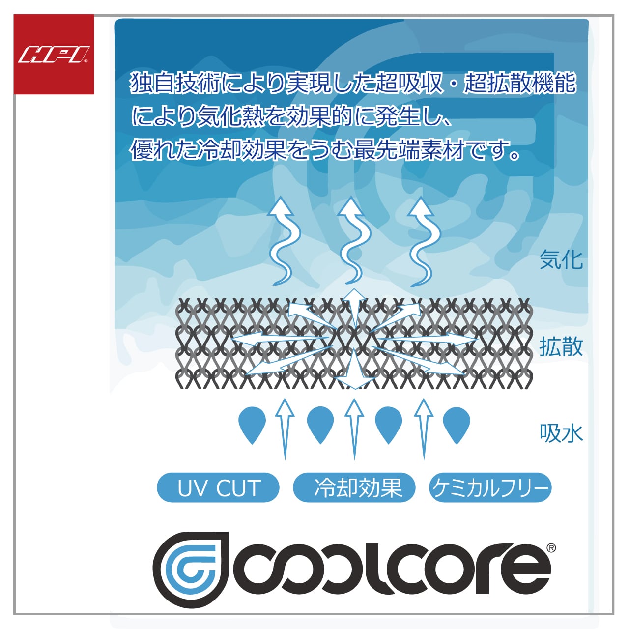 代表的な冷却素材として肌に接触した部分を冷たく感じさせる生地の接触冷感素材は、ミント・ハッカ系液剤を生地に染み込ませた製法を用い肌に接触した部分を冷やすものが有ります。この接触冷感素材は熱伝導性に優れていますが冷たく感じる感覚はファーストタッチの一瞬となります。それに対し、このCOOLCOREは気化熱を最大利用し冷却に必要な水分が有る限り独自のクーリング効果が持続されます。